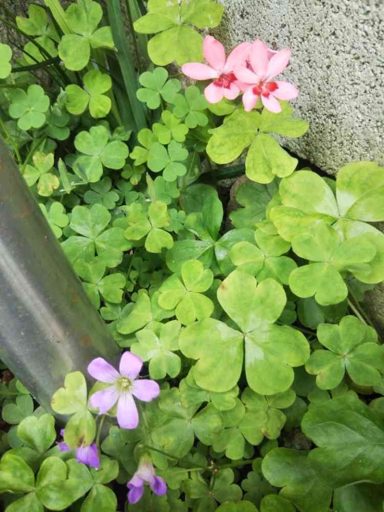 カタバミが壁の間に重なり合ってるの