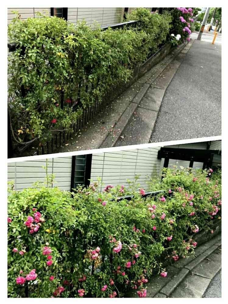 カットしたバラ🌹を『あげるって』頂き、挿し木したら運良くついて、伸び過ぎろからと困ってフェンスに巻きつけて出来たから、終わった花と歩道側に伸びるツルを切るだけしかして無いです。
