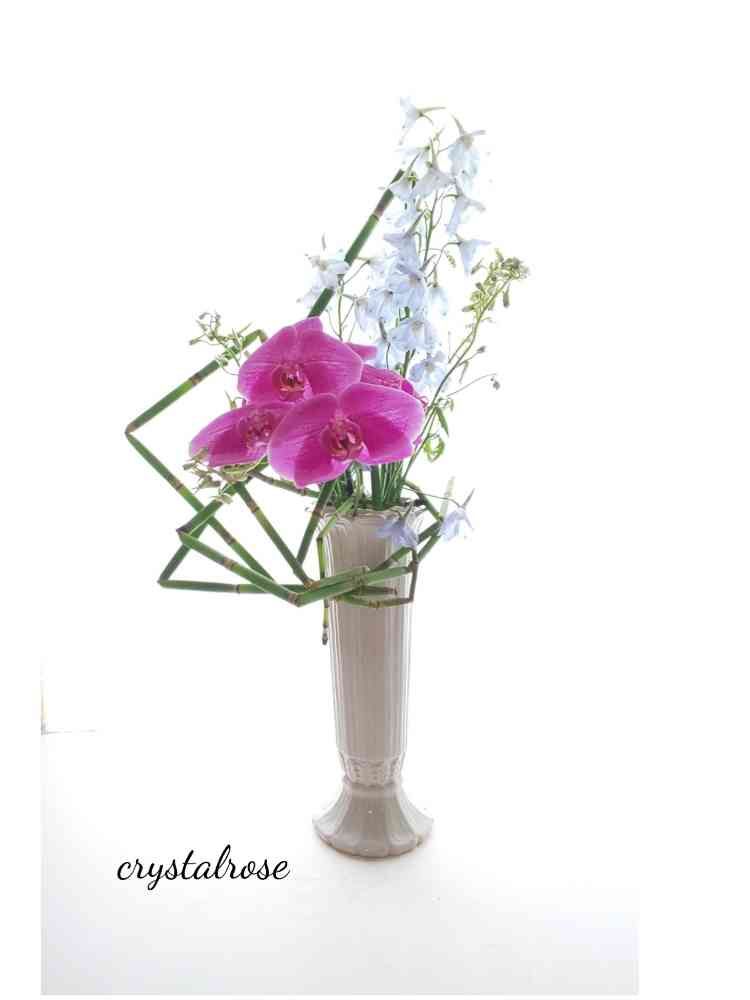 とくさ、胡蝶蘭、デルフィニュームをいけこみ。