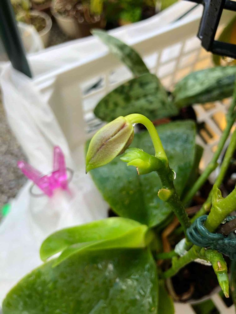 半年まえ「座間洋ランセンター」で購入した株で、仮花茎から蕾が大きくなってくれました。