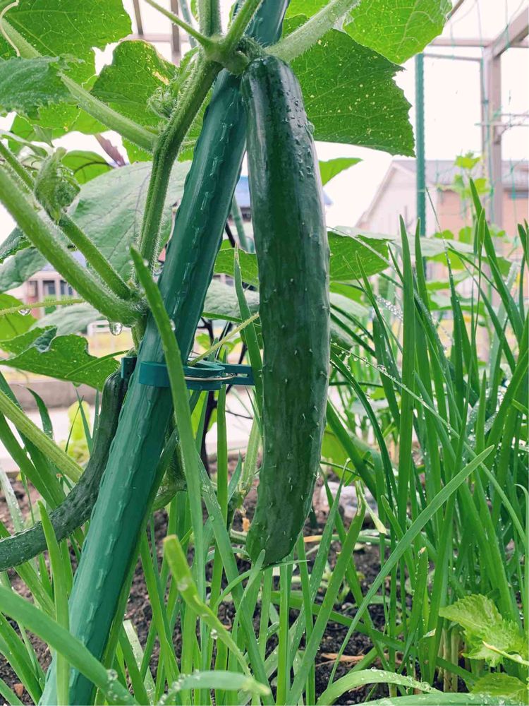 きゅうりを囲むニラ達です😊きゅうりは曲がってしまうことが多いですが、こちらはなかなかの美人です🥒