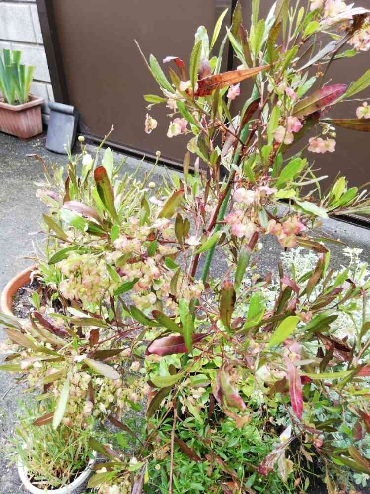 蝶々の様な濃いピンクの3枚の花びらの様な種のようなものが、沢山ぶら下がっています。何という植物でしょうか?寄植えに入ってました。