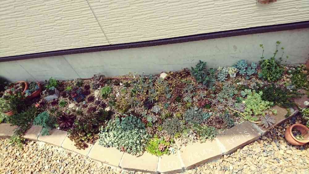 ↑玄関横の多肉花壇。全体像です!ミセバヤがどんどん増えて、大きなセンペルを飲み込もうとしています(´ロ`ノ)ノ