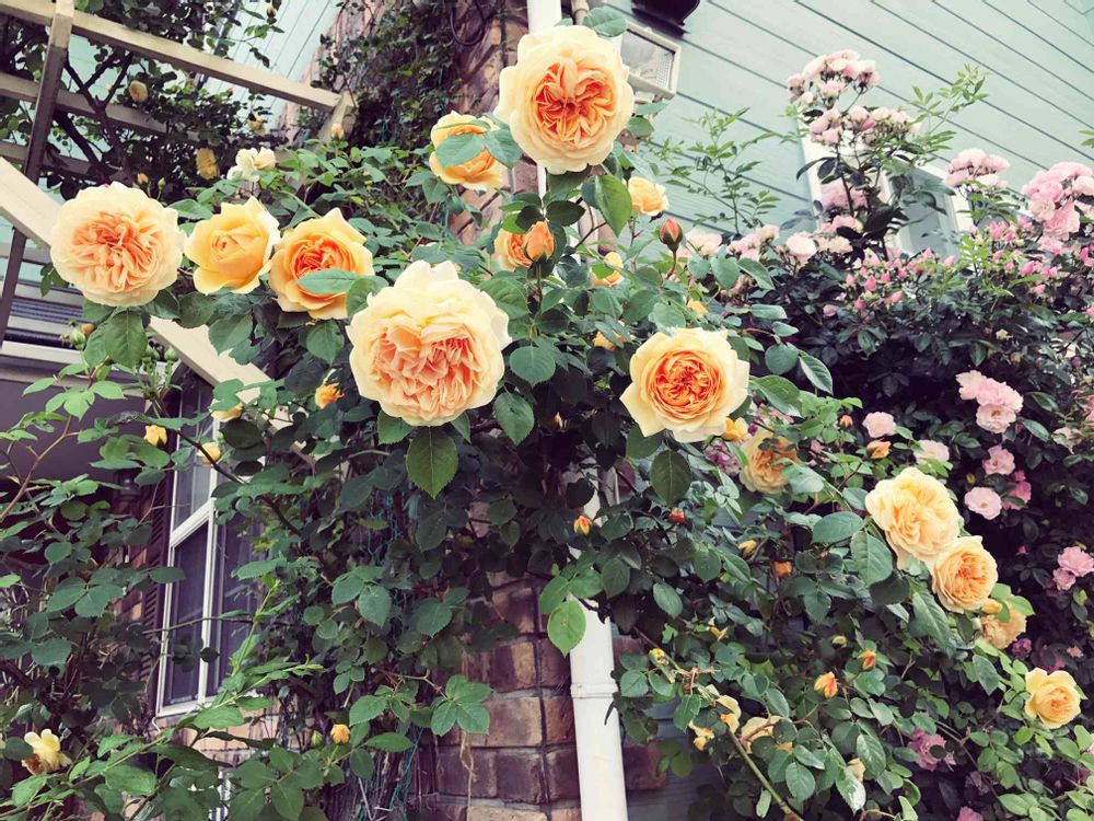 玄関の軒先に 鈴なりのグラハム トーマスが