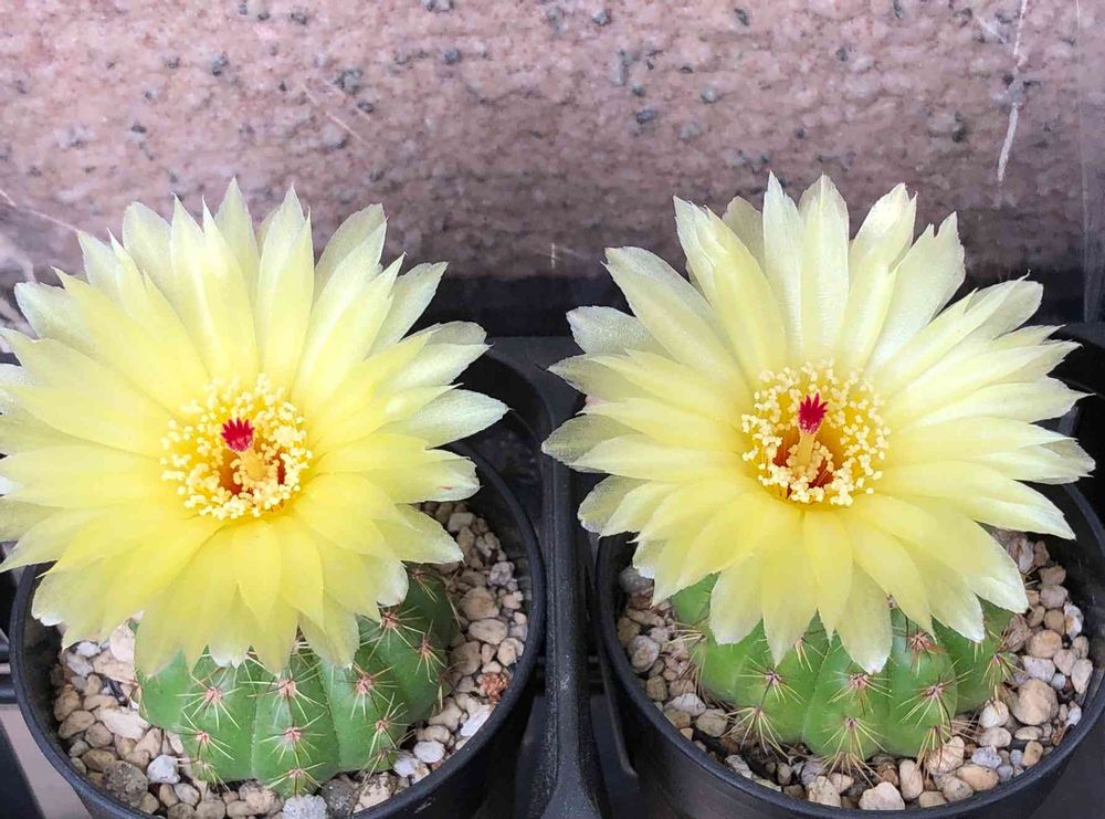旧ノトカクタスの仲間はこう言う見た目のお花が多いですし、青王丸と美青丸は元々近縁種で、株の見た目は若苗のうちは見慣れた人でも判別つけ辛いそうですからさもありなんですが、それにしたって花も株もそっくりになりました。