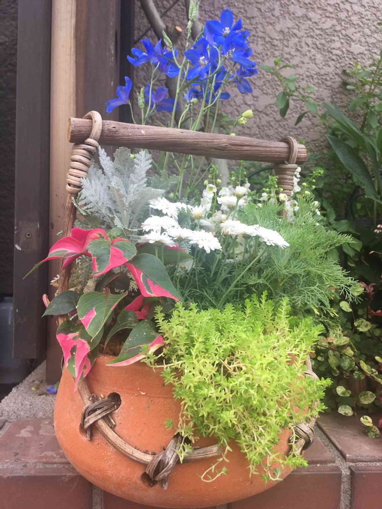 母からもらった寄せ植えの鉢に冬仕様のを植えていましたが、いい加減死にそうなのもいたので夏っぽいものを植えました。