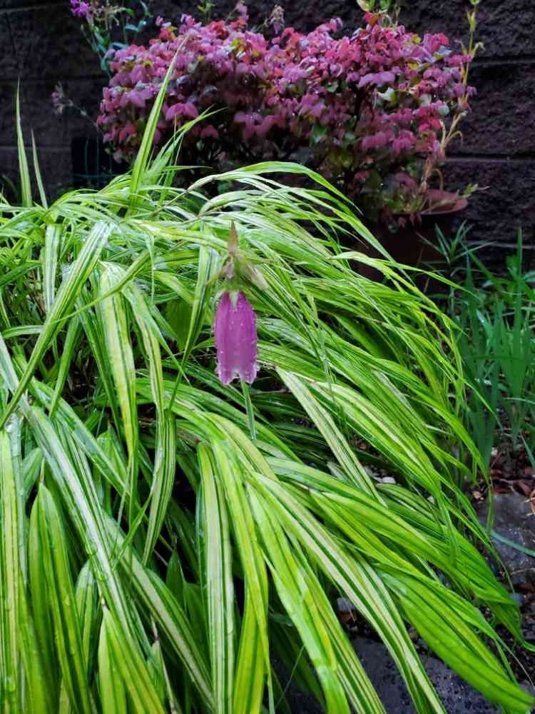 ☔️にしなだれた葉から可愛いホタルブクロですね💜