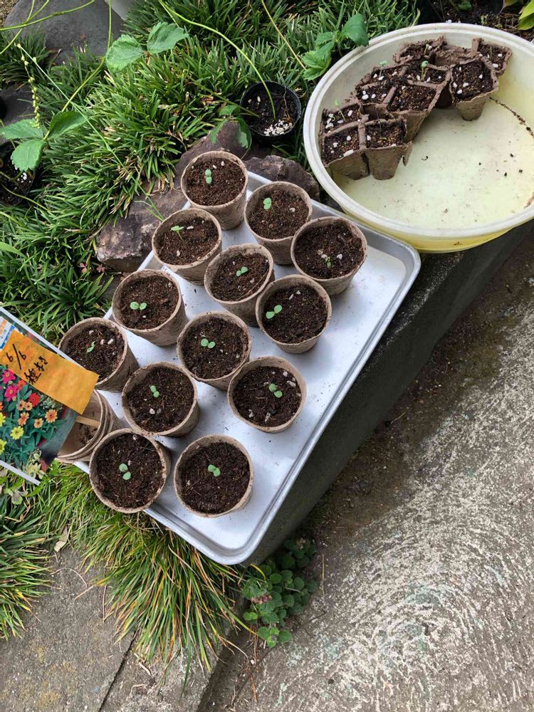 種まき後順調に、種まきポットに発芽して綺麗に並んだ新芽の双葉が所々変❗️