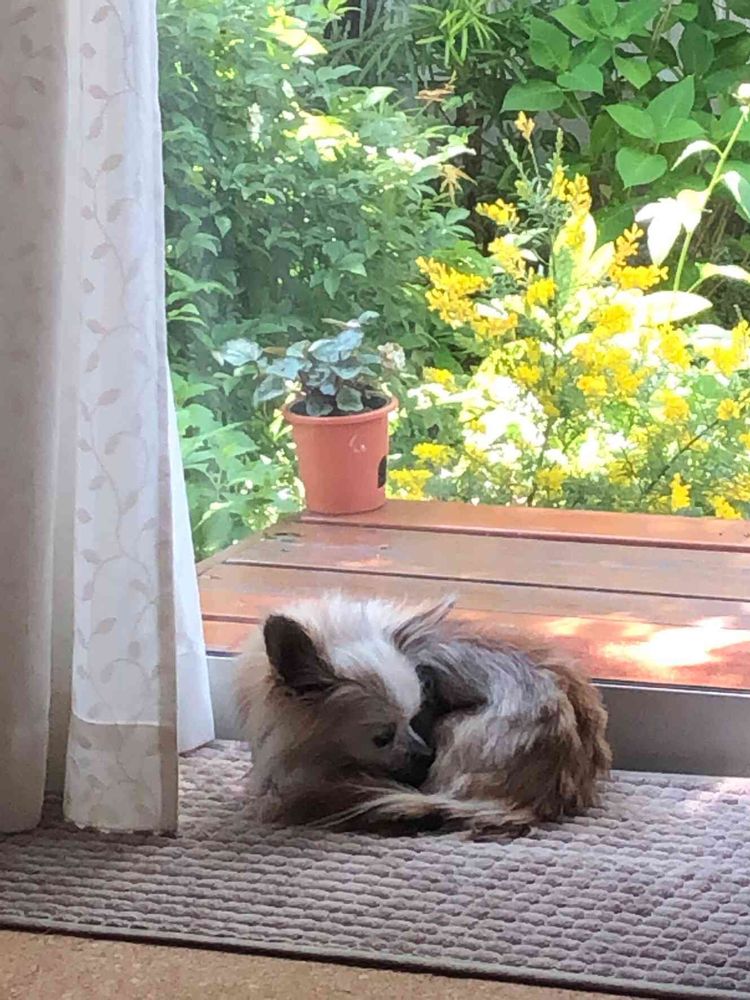 「ここ、ボクの指定席なんだよね〜♪今日もお昼寝で忙しいワン」🐕歳とって最近おとなしいから、時々起こして歩かせます。
