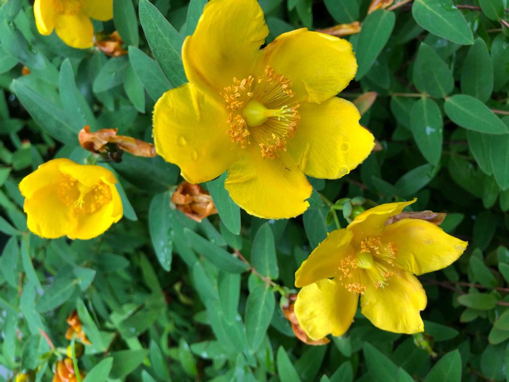 キンシバイより花弁が大きく開き、黄色味が濃く、花弁に少し切れ込み?があります。そして、葉は十字対生です😊