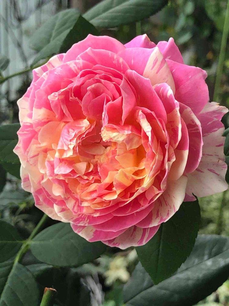 桃色、クリーム色、白色の絞り咲きで咲き始めはカップ咲きでロゼット咲きへと変化。