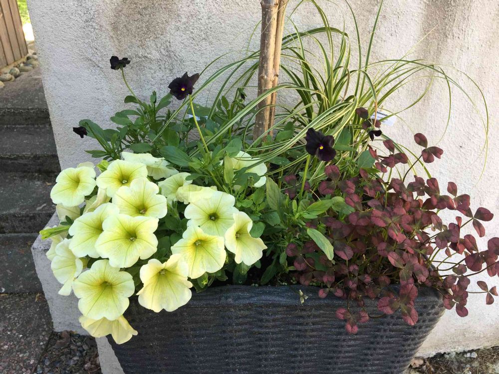 ビオラのモリーサンダーソン、ライムがかったペチュニア、ブラッククローバー、グラスの組み合わせ。グラスはオオシマカンスゲのフェザーフォールス。