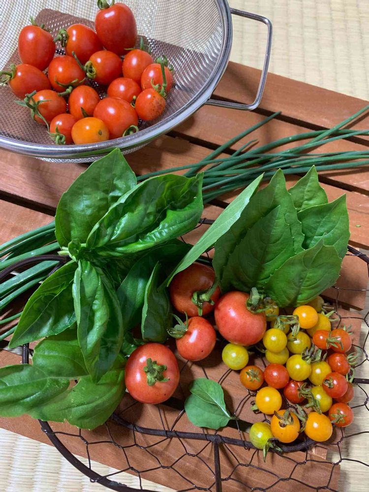 ミニトマト4種、バジル2種、チャイブ、ルッコラ。