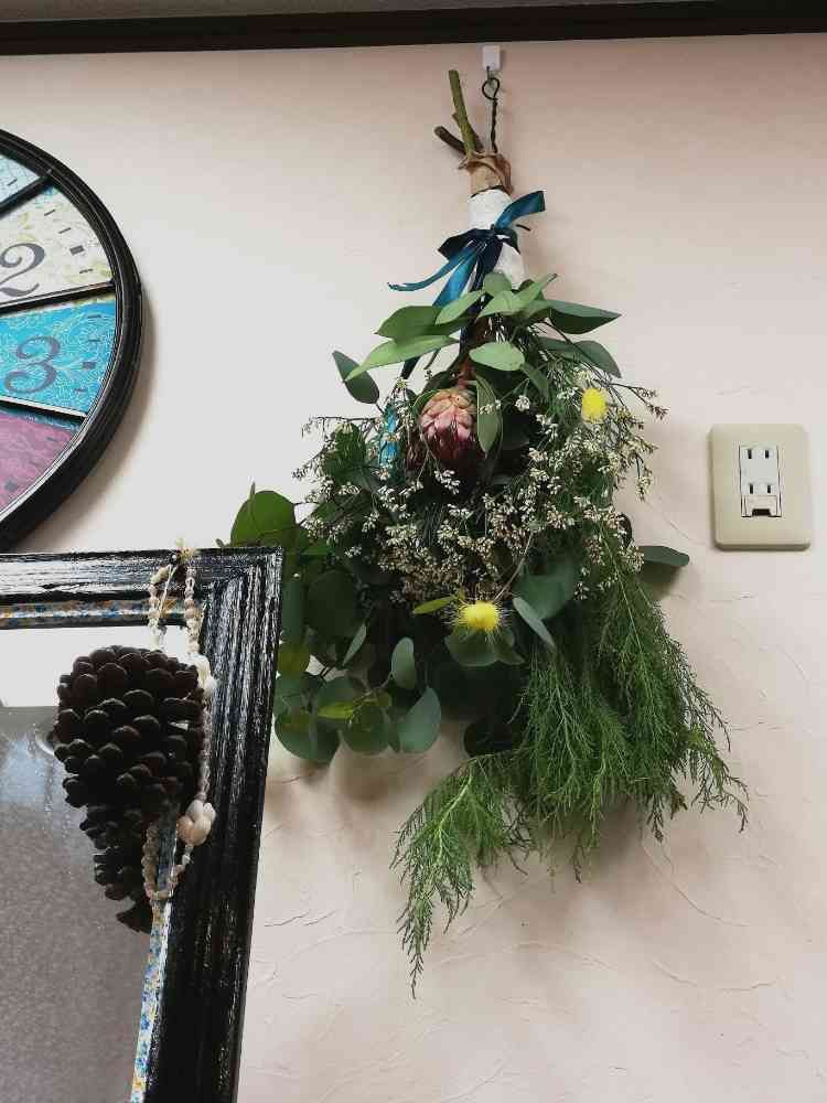 近所の花屋さんでみつくろってもらい、くるくるっと巻いてぶら下げました~