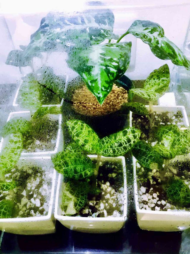 ジュエルオーキッドとアグラオネマの水槽です😊旦那さんの趣味ですが、アグラオネマを加湿で育てるか、常湿で育てるか悩んでるみたいです😅現在、加湿中💧どう違うんだろう🤔
