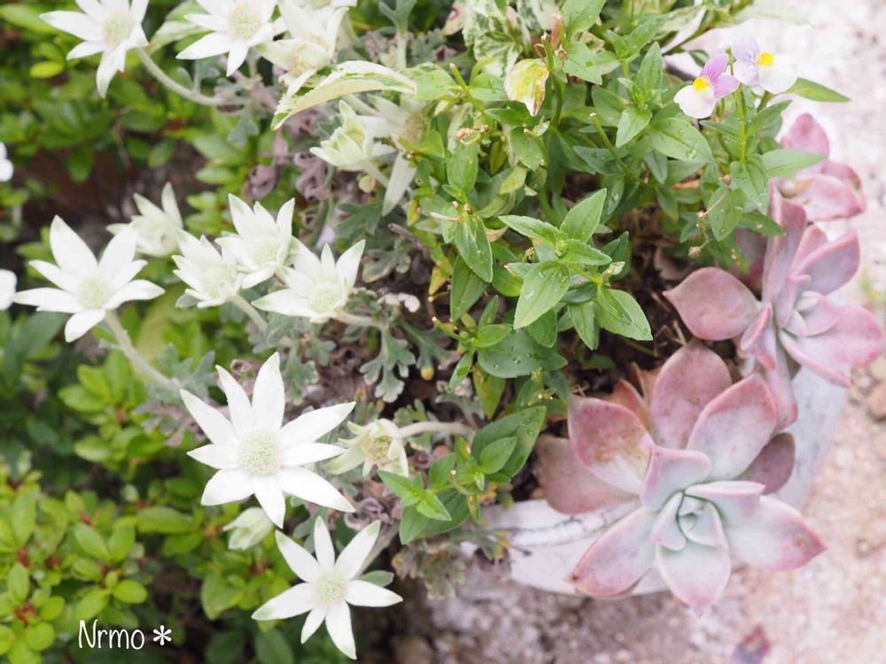 去年の、フランネルフラワーの白いお花が咲きました、おぼろ月さんはピンク色になってます💕