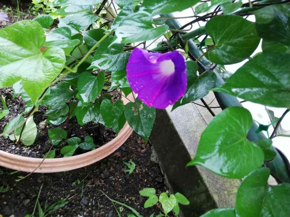 写真に普通のアサガオも入ってますねw去年こぼれた種が、この雨で一斉に芽吹いてます