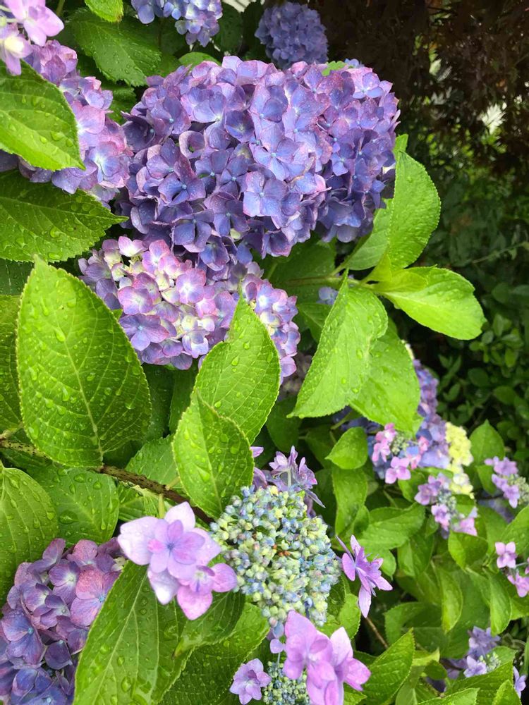 微妙な色の違いが道行く人の足を止めるようです。手前の額紫陽花も。