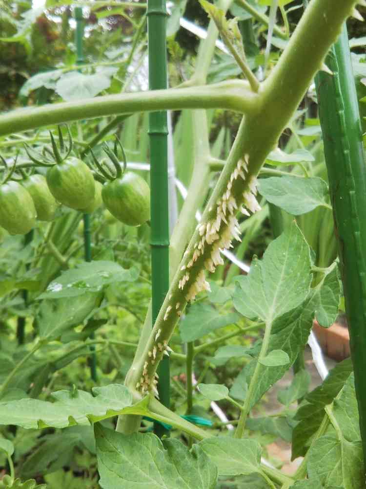 ミニトマト、実がついてきたのですが、今日見たら茎に白いトゲ?根っこ?みたいなものが~😱これはなに?