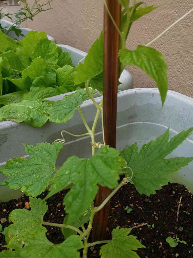 100円で、買った白ゴーヤの苗です。果たして実が成るのか?小学生の気分です。←左のプランターには、サンチュの葉がワサワサ増えました。さらに、その隣は、ルッコラで、花が咲いてしまいました。💚😖🙃
