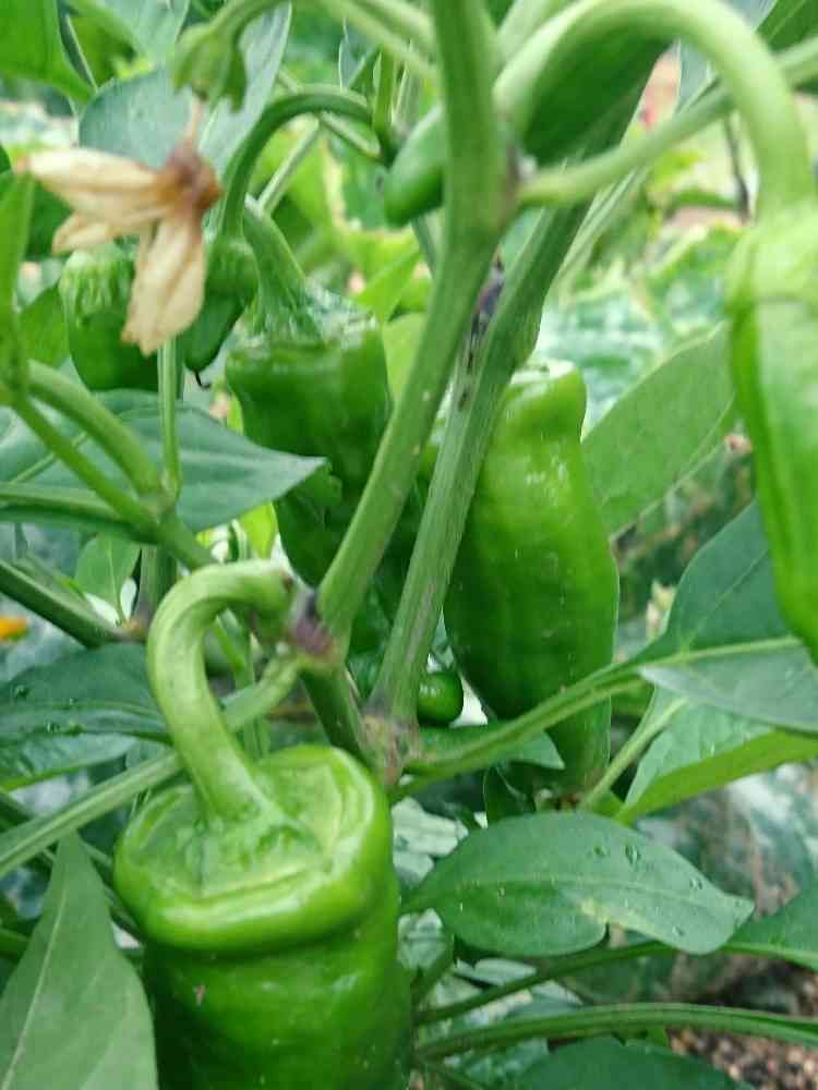 万願寺トウガラシ、たくさんなりはじめて、嬉しい😊🐶💕畑に行ったとたんに、雨🌁びしょ濡れです。😥