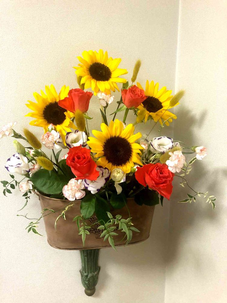 ヒマワリ🌻、トルコキキョウ、カーネーション、バラ、ラグラスを買ってきて、オアシスに初挑戦。お手頃価格でおうちでアレンジ楽しかったです。❤️💛💚💜元気が出るね(^^)