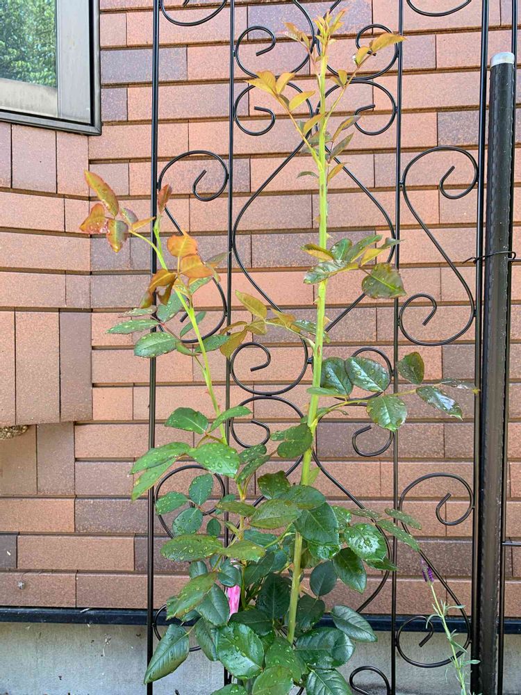家の今年植えたつるバラ ラビィーニアです。株の根本から立派なシュートが勢いよく伸びて、元々あった枝を追い越して太く大きくなって来ました。写真の左が元々あった枝で右が新しいシュートです。
