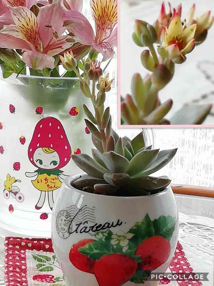 いちごちゃん柄のカップがあったので、庭に咲いてたアルストロメリア🌸を挿して、いちごの日🍓に初めて参加が出来たよ〜🍓🍀🎀