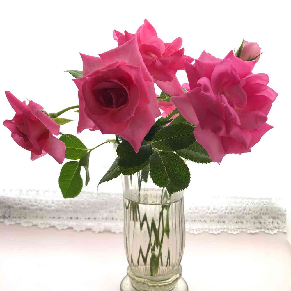 さん 朝、せっかく咲いたバラの花が、雨のしずくでグッタリうなだれていたので、切り花にしてグラスに挿したんですよ😃🌹
