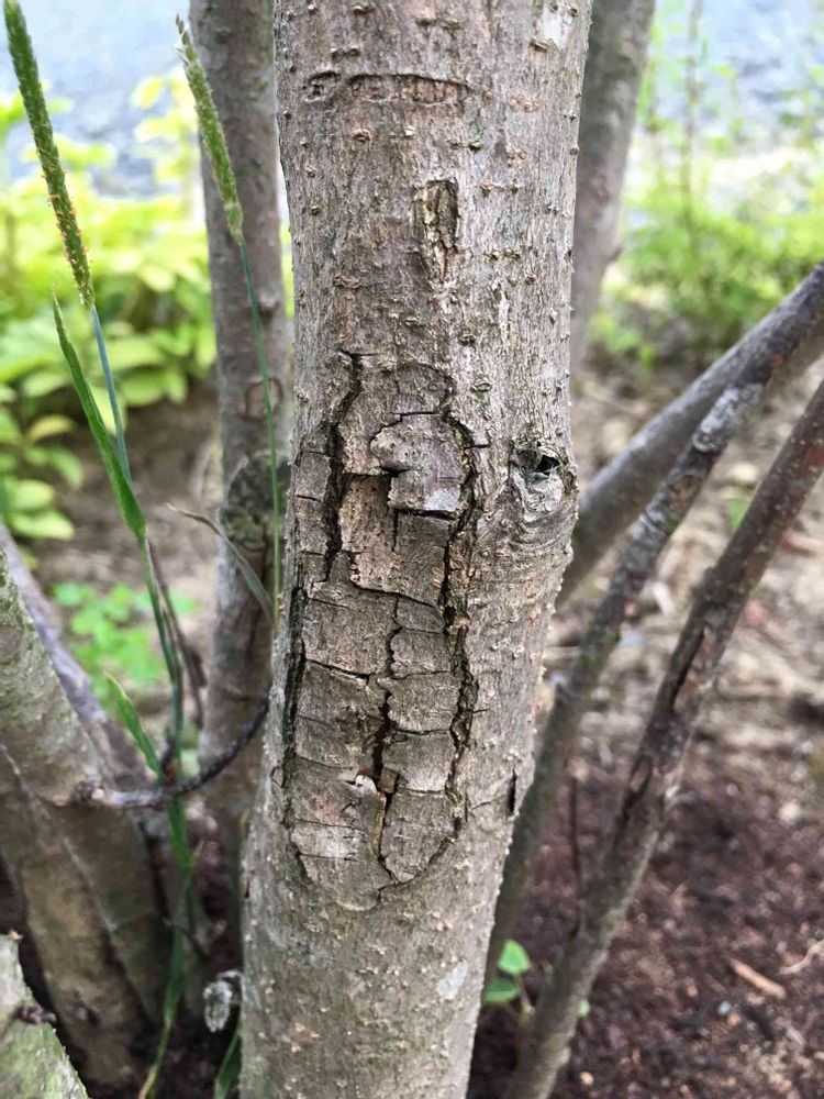 マルバノキです。植え付けて2年目ですが、ずっと元気なくて。一応春に新芽出ますが葉数少なく小さいままで、初夏に赤く灼けて落葉してしまいます。根元の亀裂は害虫か病気でしょうか?😢