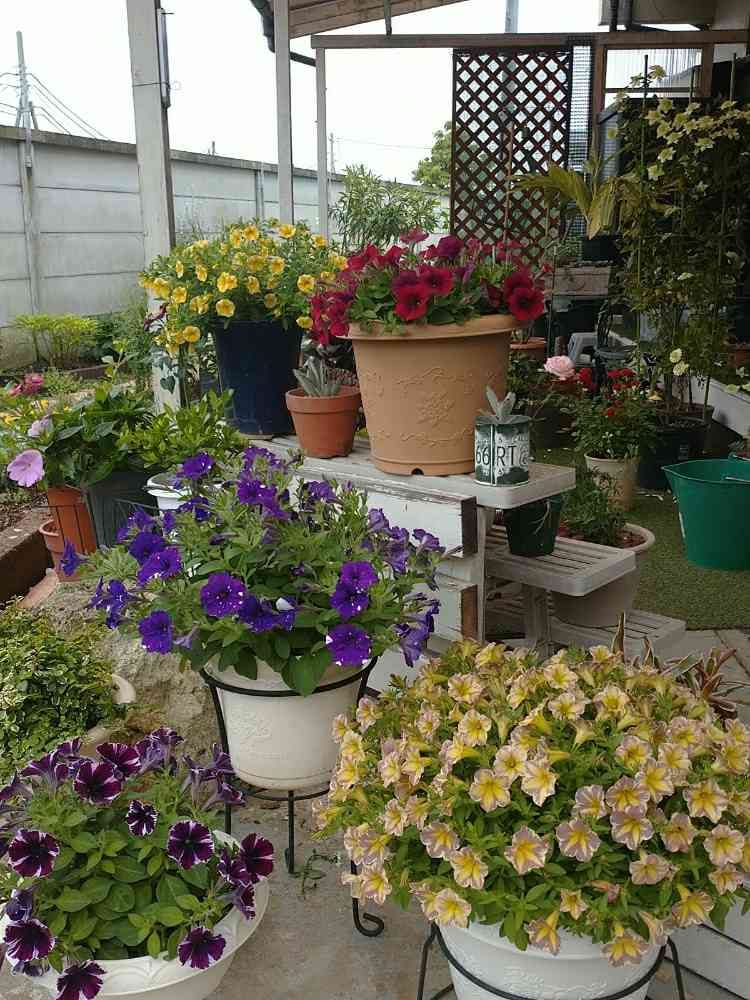 昨日の大雨でテラス下に待機させていたペチュニア、サフィニア軍団です。とらネコは2回目の満開です。これからとらネコとナイトスカイは切り戻します💪