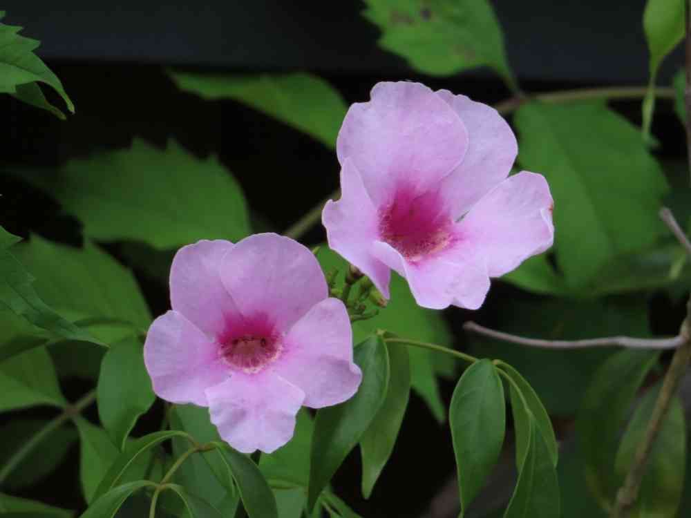 ソケイノウゼンはオーストラリア原産で、夏~秋に桃色の漏斗状の花を次から次に咲かせるノウゼンカズラ科の常緑蔓性低木。 花色は桃色から紫色で、中心部が濃桃色をしている。 蔓性の茎が木やフェンスなどに巻き付き伸長する。 葉がナンテン(南天)のような羽状複葉で似ておりナンテンソケイ(南天素馨)とも呼ばれる。草丈約7m、花径4~5cm、開花期6~10月。
