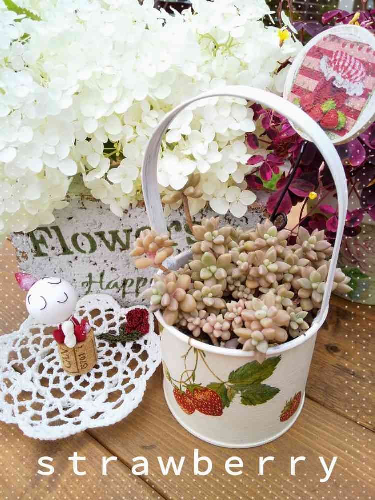 いちごのリメ缶、かわいい💕すごく姫秀麗にあってますね💕ハピコロちゃんもやさしい顔で応援してくれてますね🎶アナベルがふわふわとしてかわいい💕