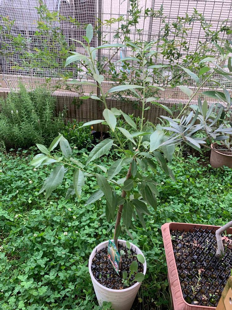 アーモンドの木。1カ月経ってだいぶ枝葉が伸びてきました。