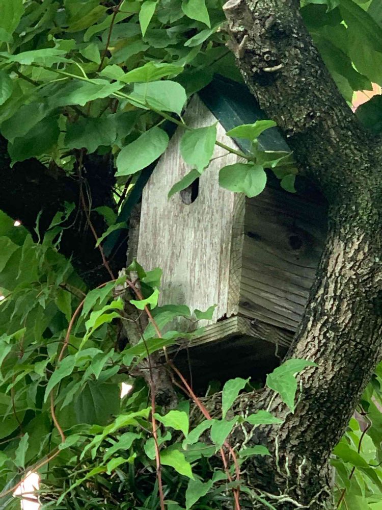 杏の木に懸けた巣箱。もう何年も空き家です。😂今年は下見にはきたんですが、どうもお気に入り召さなかったようです。😅