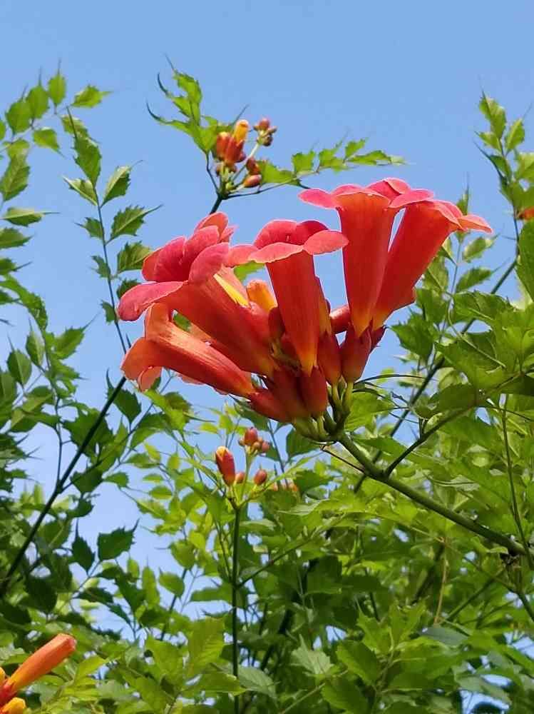 アメリカノウゼンカズラが鮮やかです。普通のノウゼンカズラより細長く朱色が濃いですね。