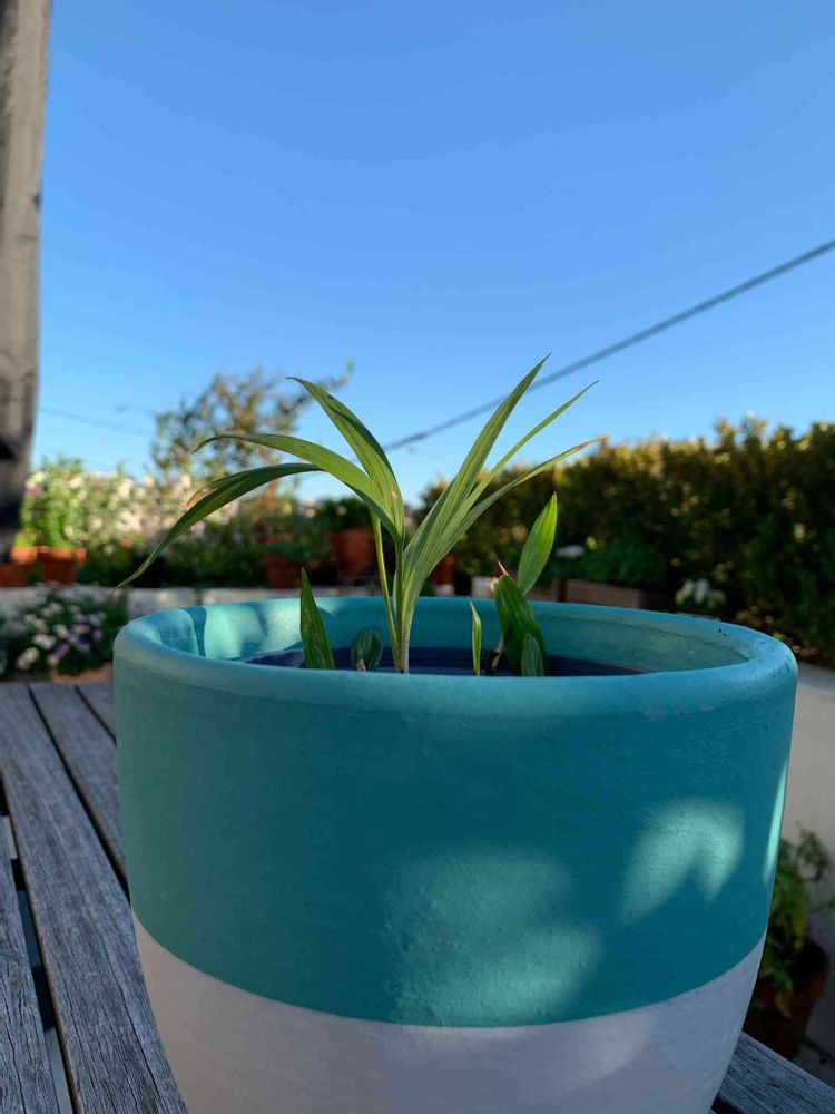 昨日のヤシの種から発芽したものを数本寄せて植えてみました🎶
