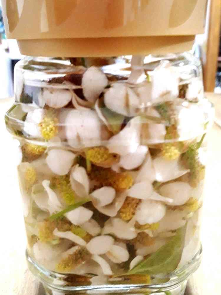 材料はドクダミの花や蕾🎵または葉です🙆それを洗って水分を飛ばしたら👌ウォッカか焼酎を熱湯消毒した瓶に入れ2週間後位に出来上がりです😉👌