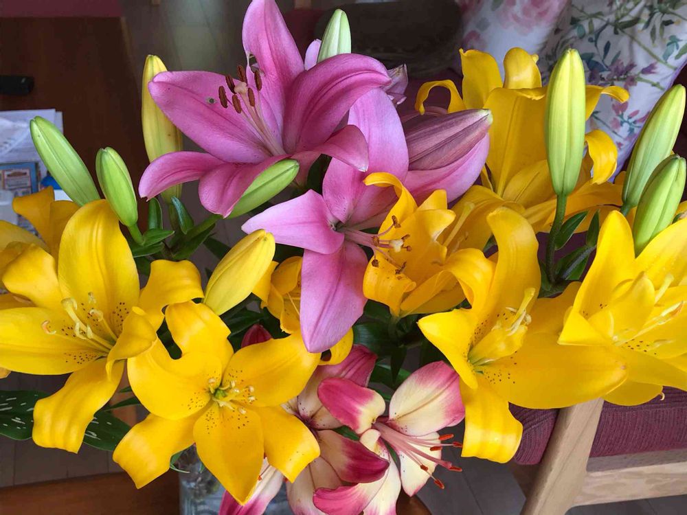スカシユリが今年もたくさん咲いたので、飾りました。リビングが華やかになり、甘い香りに癒されています。