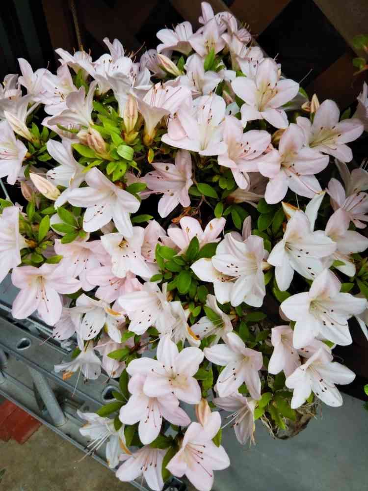 さつき❗️満開になりました。園芸師匠から頂き五年目以上、こんなに花咲いたのは初めてです。うす肌色 色っぽさ等頂いた、さつきの中で一番好きな物です❗️四号平鉢200近くも咲いてます。だいたいの数👴だよ😃同鉢 二投稿👀📷️めです❗️
