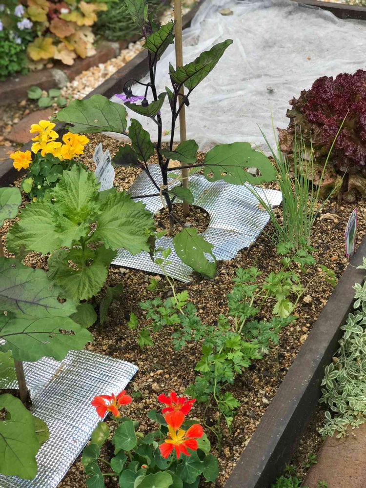 ナス🍆の周りに、葉ネギとイタリアンパセリ植えました。
