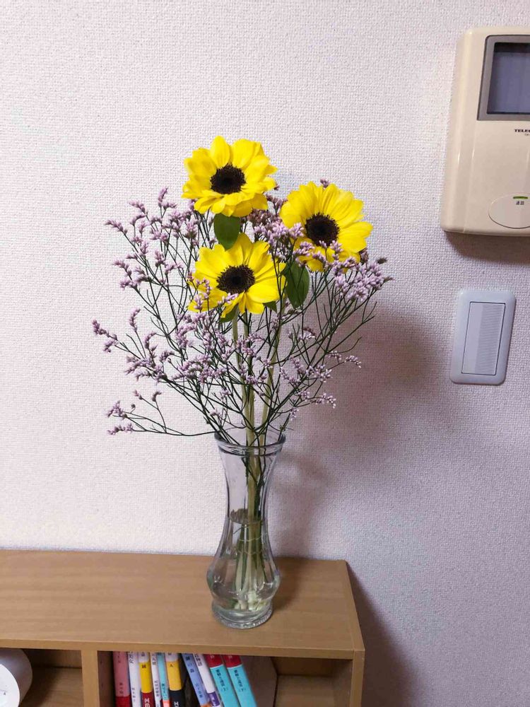 ひまわりと、小花はブルーファンタジーというお花だと思います。ドライフラワーにもオススメです💐🌟