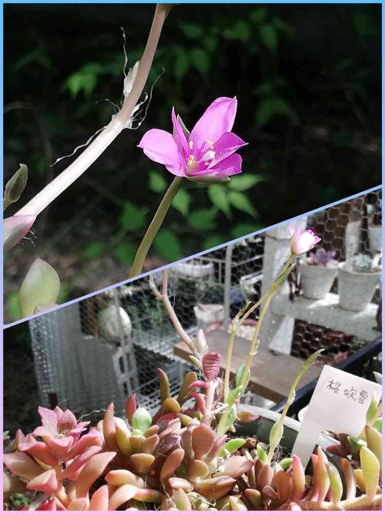 リビングから 庭を ふとみると 緑のなかに ピンクの小さな花が 目に飛び込んできた➰🎶