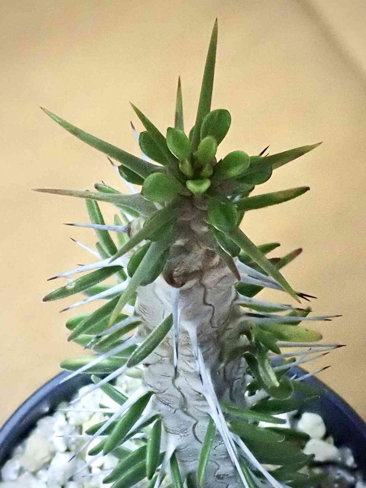 トゲが緑だ!トゲが葉の変形だとよく分かりますね🤩成長につれて反時計回りに螺旋を描きつつ、トゲと通常の葉とを整然と出してゆく数学的な植物。数学は苦手ですが、この植物は面白いと思います。