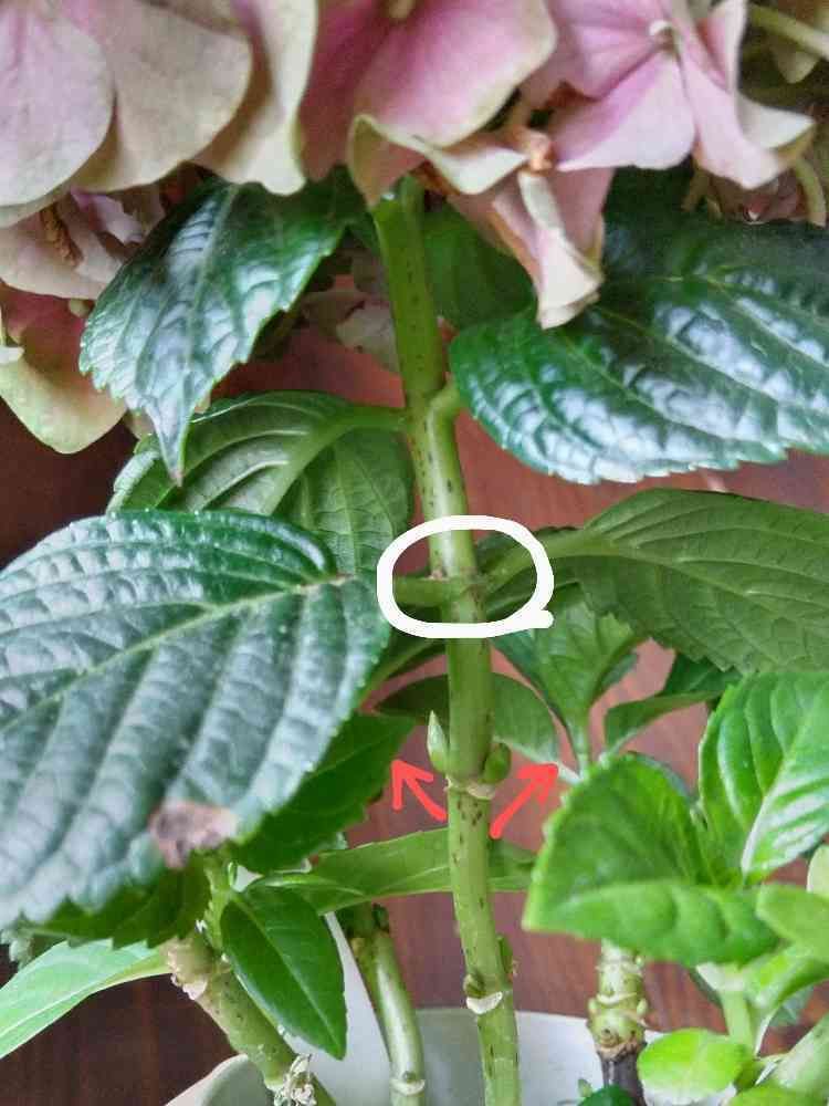 ノブレスぽい紫陽花の剪定、挿し木を考えること邪魔な芽があったので、鬼ヤドカリさんを見習って芽かきしました。