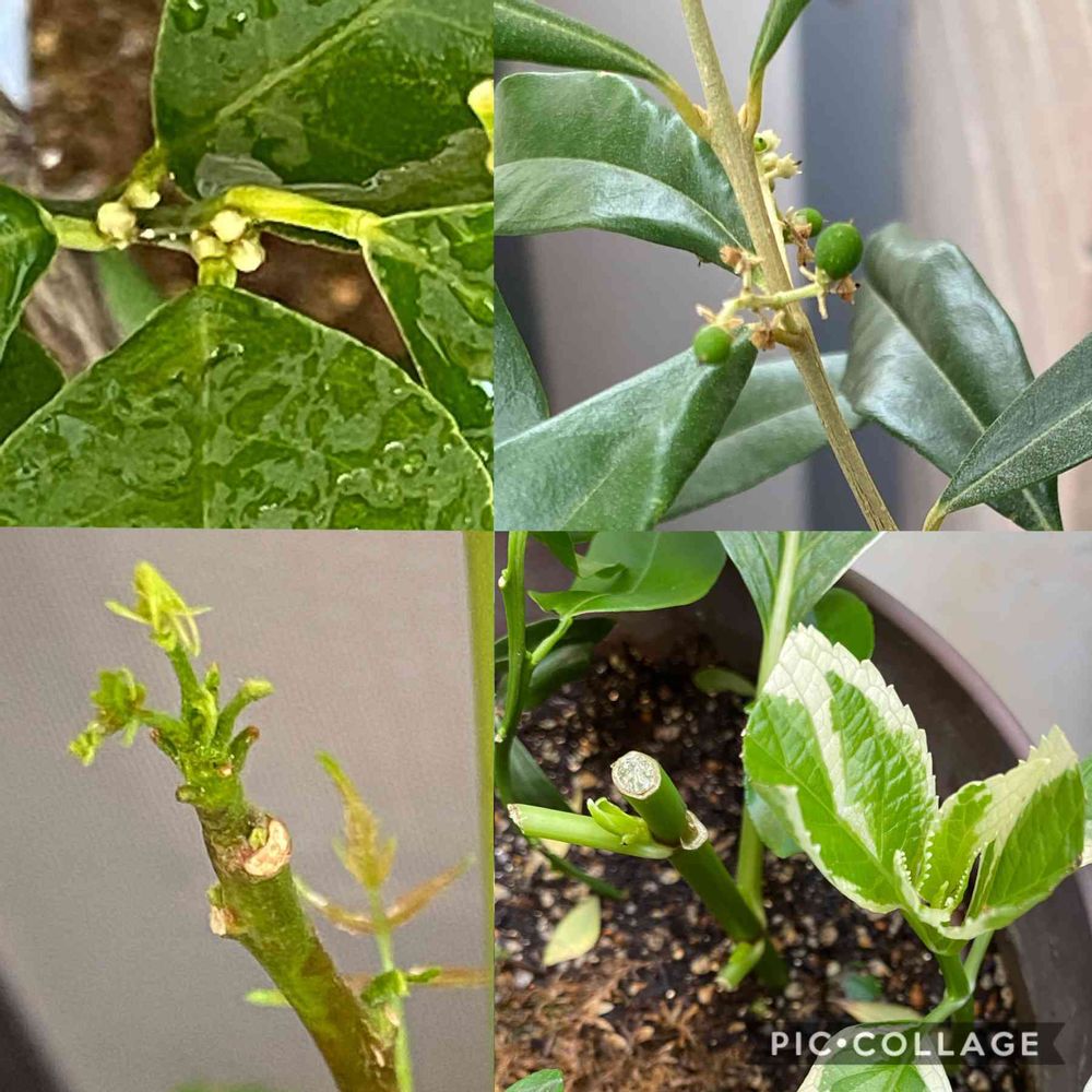左上:今年、葉が1枚も増えなかったレモン。何故か急に花芽が30くらい出てきた。葉が増えてないからまた落ちてしまうかもしれないけど生きてるのがわかって嬉しい💕