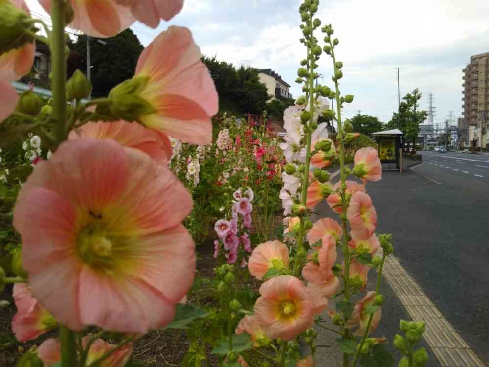 ある程度近場の歩道橋向かいにあるバス停の待ち合いスペースに咲く