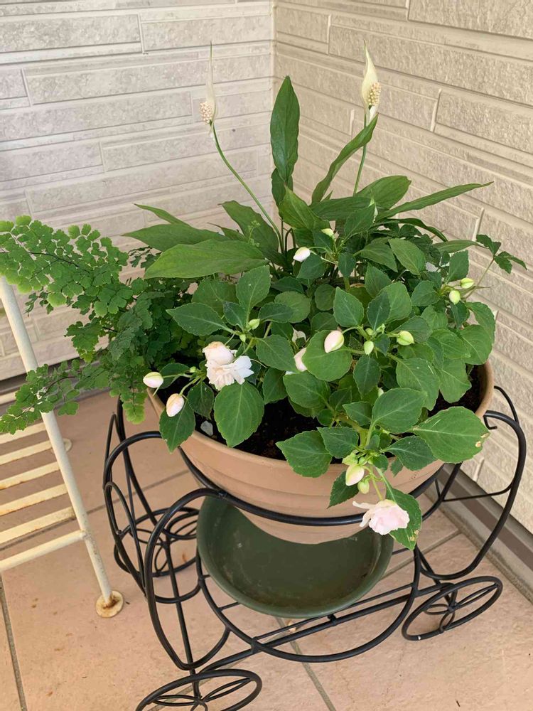 スパティフィラムとアジアンタムの寄せ植えを作りたくて。八重咲きインパチェンスとシュガーパインがいい仕事してます。