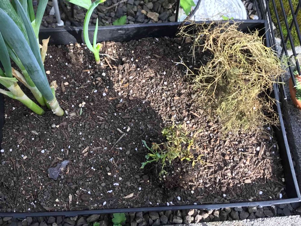 とりあえず寄せ植え鉢から抜いて、プランターの空きスペースに置いて、根っこ乾かし中です。