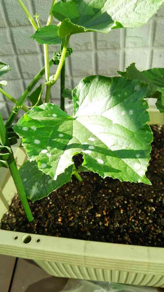きゅうりの葉っぱに斑点模様ができてる。これは病気?(´・c_・`)